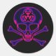 Pegatina negro con un cráneo vívido símbolo de riesgo biológico y diseño de cruces en azul y rojo.
