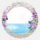 Pegatina tropical con luces brillantes en el agua y una corona reluciente con flores de lavanda