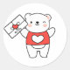 Este delicioso pegatina cuenta con un adorable oso blanco con mejillas rosadas y una sonrisa de contenido, mirando desde una caja de regalo roja adornada con un corazón. Sobre el oso, tres corazones flotan para significar amor o afecto. El diseño general transmite un sentido de alegría, calidez y el acto de dar desde el corazón, haciéndolo perfecto para expresar amor, aprecio o para ser usado en ocasiones especiales como el Día de San Valentín.