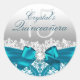 Verde azulado Pegatina de Quinceañera. Elegante diseño de damasco Verde azulado y blanco con arco de seda perla. Personalizar con sus propios detalles. Atención: todas las imágenes planas. ¡No tienen arcos, encajes ni joyas de verdad!