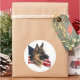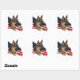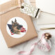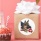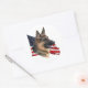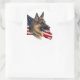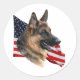 Un noble pastor alemán delante de una bandera estadounidense ondeando en un pegatina.