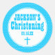 Pequeños puntos blancos en azul brillante crean un borde festivo para el pegatina bautizante de un niño. Su nombre está en la parte superior del pegatina, luego la palabra bautizo y la fecha del bautizo. Una pequeña cruz azul completa el diseño. Puede cambiar fácilmente el texto, su color e incluso su fuente. Dulce y único para el día especial de tu niñito.
