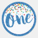 Este pegatina colorido coordina con la colección de cumpleaños primero del Purpurina Azul Confetti. Los pegatinas son perfectos para etiquetar las bolsas de regalo, los cubrecamas o las cajas de favores.