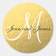 Pegatina del Favor de la Boda Negra de Oro con nombres de novias y novios y apellido monograma inicial. También se puede usar para Sellos para sobres de Invitación a la Boda. Personalizable completo. Elke Clarke© para MonogramGallery en Zazzle. Otros colores disponibles en nuestra tienda. Efecto fotográfico impreso del Relieve metalizado dorado en el fondo con monograma blanco y texto de escritura negro. Perfecto para una temática de boda negro y dorado.