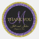 Versátil, monogramado personalizado y elegante favores matrimoniales gracias pegatina con un brillante círculo purpurina morado y dorado, elegante letra de guión para el apellido inicial y diseño de novia y novio en un fondo negro. Estos pegatinas de monograma de personalizados pueden ser usados para favores de boda y tarjetas de agradecimiento. stickers modernos y contemporáneos de bodas de glam. Purpurina es un efecto fotográfico impreso.