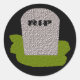 Este conjunto de pegatinas redondos es fiel y cuenta con una lápida gris con RIP en la que se le coloca un texto sobre un trozo de hierba verde. A diferencia de este diseño mórbido, el fondo es negro.