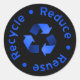 Reducir, reutilizar, reciclar pegatina en negro con texto azul y símbolo de reciclaje.