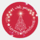 La tipografía blanca brillante moderna en forma de árbol de navidad, rodeada por el borde de texto "Feliz Navidad" decorado con brillantes estrellas, el diseño está aislado en un fondo rojo. Estos elegantes stickers navideños de navidad son perfectos para usar en sellos para sobres, envolturas de regalo, favores de fiesta y más! Haga clic en el botón de edición/personalización para personalizar este diseño con su nombre o texto personal.