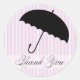 ¡Ideal para las duchas de bebés o de novias! Gracias en un fondo de rayas moradas con paraguas negros.
