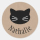 Nombre pegatina/ etiqueta, con un símbolo de gato negro con whiskys blancos en una foto de papel marrón como fondo.