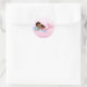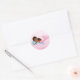 Este pegatina redondo de sirena está pintado en tonos rosa y azul. El pegatina está diseñado con una hermosa sirena afroamericana con rizos, pelo largo, cola de pescado rosa y delfín.