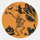 Pegatina de Halloween con esqueleto bailando, gato negro, linterna jack-o’, bruja, murciélagos, fantasmas y araña sobre un fondo naranja. Perfecto para decorar favores, álbumes o regalos de fiesta