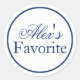 "Su favorita" boda de novia favorece a Pegatina en azul marino. Pegatinas para cualquiera de sus ocasiones bodas - fiesta de compromiso, cena de ensayo, ceremonia, hora de cóctel, recepción de bodas, brunch dominical, ducha de novia, fiesta de soltera, fiesta de gallinas y más! Muestra su bocadillo y su tentempié favorito o traza como un favor para tus invitados. Disponible en una variedad de tamaños colores y fuentes