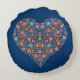 Cojín decorativo o colchón redondo de moda, con un patrón floral en forma de corazón sobre fondo azul que se puede cambiar si se desea. Parte de la colección "Folk Heart" de Posh & Painterly, inspirada en el arte folclórico de Europa del Este.