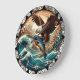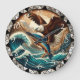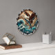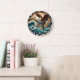 Este reloj circular de pared tiene un majestuoso águila calva con alas estiradas, que se eleva sobre un océano tormentoso y se aferra a un pez en sus talones. El fondo muestra montañas escarpadas y un cielo cubierto de sol. La cara del reloj está bordeada por un patrón triangular blanco y negro, lo que le da una estética fuerte, natural y salvaje.