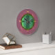 Borde rosa salmón de bonito con un centro iluminado en verde lima. Este reloj circular de pared de la cocina también está disponible en forma cuadrada. Los números dorados completan este diseño.