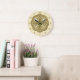 Este elegante reloj tiene un intrincado medallón de círculo dorado que se asemeja al bronce envejecido, rodeado de números de oro antiguos. El fondo es de color crema, con un toque floral abstracto que se repite a la luz, lo que añade un toque de lujo. Añada un aspecto extravagante a su casa con este reloj.