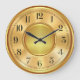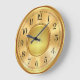 Un falso ilustracion dorado de una cara de reloj con números modernos y un anillo exterior para la mano de los minutos tiene un círculo dorado vibrante en el medio y alrededor de los bordes.