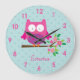 Reloj de pared personalizado con una pequeña lechuza personalizado rosa sentada en una rama con hojas verdes, flores rosadas calientes y puntos de polka acuático. Diseño divertido para chicas. Regalo de nombre de personalizable.