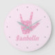 Este reloj con el nombre de un chica dulce con el signo ASL (American Rótulo Language) "I love you" (te amo) y el patrón de corazones rosados es perfecto para una guardería o decoración de habitación para niños. El nombre se puede personalizar a cualquier nombre o texto.