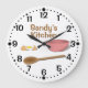Este reloj de pared de la cocina personalizado tiene la imagen de un recipiente, una cuchara de madera y un huevo roto. Dice la cocina de Sandy. Reemplace el nombre de ejemplo de la plantilla con el suyo propio que desea personalizar. Haga clic en personalizar para cambiar el estilo o el color de la fuente. El reloj tiene números negros para las horas y puntos negros para los minutos, pero puede eliminarlos si lo desea. Más diseños de amantes de la comida y relojes de cocina personalizado en el lápiz de Alina.