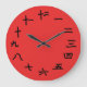 Números chinos en un reloj de pared con un hermoso fondo rojo. El rojo y el negro son los colores asiáticos tradicionales y se ven fabulosos en este reloj. Cuelgue en la biblioteca, en el jardín, en la playa o en la oficina. Este reloj haría un regalo único para el calentamiento de la casa o el calentamiento de la barca (o el calentamiento de las casas). Disponible en dos tamaños de reloj redondo, o un reloj cuadrado. Copyright Scarebaby Design.