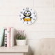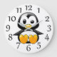 Reloj de pared con una foto de un pingüino lindo sobre un fondo blanco.