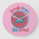 Un reloj con un carrito de golf, con la frase "Rompe de la hierba" centrada alrededor de la imagen. El diseño sugiere una escapada relajante y relajante del estrés diario.