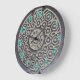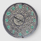Cubierta de alcantarillado para el acceso de la compañía telefónica, Patrón metalizado negro de hexágonos rodea el emblema de la empresa. Los números tridimensionales azul-verde marcan las horas.