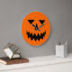 Negro sobre la cara de linterna de calabaza naranja con ojos y nariz triangulares y una sonrisa malvada.