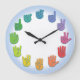 Reloj de manos en lenguaje de señas ASL, con las manos en colores de rueda de color, sobre un fondo blanco.