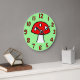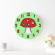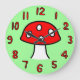 Un reloj con hongos rojos y números rojos a juego. El fondo verde puede cambiarse a cualquier color.