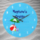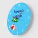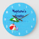 Un reloj personalizado con divertido arte de juguetes esenciales para la playa o la piscina una pelota de playa roja, paraguas verde, sandalias y aceite bronceador en un fondo azul con olas rizadas y números blancos opcionales. Haga clic en Personalizar para cambiar las fuentes, los colores e incluso guardar su diseño para más adelante.