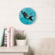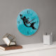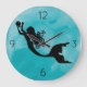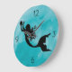 Reloj liso, contemporáneo con una silueta encantadora de la sirena contra un fondo de la acuarela de las azules turquesas. Números y manos negros.
