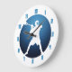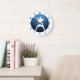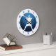 Tiroteo Lacrosse. Encerradas, coqueteadas y listas para rodar. Silueta de jugador de lacrosse sosteniendo palo, en medio de disparar un tiro sobre el gol. Diseño de emblema circular en azul con rayos emanantes. Reloj de jugador de Lacrosse. Reloj deportivo en la pared.