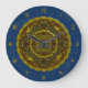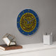 Esta mandala temática de Capricornio presenta una piedra lapis lazuli rodeada por el símbolo del signo, la constelación y el símbolo alquímico de la Tierra entre filigree y tejidos.
