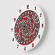 Este diseño de círculo concéntrico contiene capas de patrones geométricos que se parecen a los engranajes que se pueden encontrar en máquinas modernas o incluso ajenas, en tonos rojos y grises.