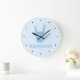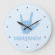 Este reloj con el nombre de un niño con un signo "Te amo" en ASL (lenguaje de señas americano) y patrón de puntos azules es perfecto para una guardería de bebé o habitación de niño. El nombre se puede personalizar con cualquier nombre o texto.