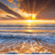 La luz del sol matutino envía ramas de oro a través de las nubes y salta del surf en una playa desierta.