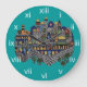 Tomé esta foto de una placa de cerámica armenia hecha a mano con una imagen colorida de la Ciudad Antigua de Jerusalén. El fondo es verde azulado y los números romanos son blancos.