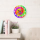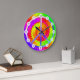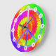 Este reloj maravilloso está seguro a por favor. Ofreciendo un signo de la paz vibrante colorido en un teñido anudado diseñe el fondo.