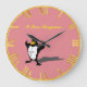 Un pingüino blanco y negro. Con una tierra de la parte posterior del rosa y un accesorio de oro alrededor de los números exteriores y de oro con un lugar para su texto para su nombre personal en este reloj.