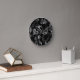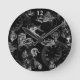 Fijan a una Alicia preciosa en collage del país de las maravillas, con Alicia, el gato de Cheshire, el conejo blanco, el sombrerero enojado, la taza de té del vintage, la tetera, y el reloj de bolsillo, en blanco en un negro para hacer esta diversión y reloj de pared temático literario precioso. Mucho más Alicia en artículos del país de las maravillas está disponible en mi tienda de Zazzle.