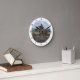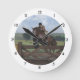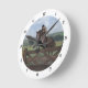 Este reloj de pared presenta una obra de arte digital original de un caballo y montado sobre una puerta de granja, creada en Vue por el artista Jayne Wilson.