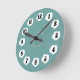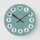 Este reloj de pared magnífico se hace en trullo suave con los acentos blancos, y el negro numera y las manos. Hay un círculo delicado del arte de la flor alrededor del centro. Disponible en dos tamaños del reloj redondo, o un reloj cuadrado. Diseño de Copyright Scarebaby.