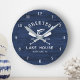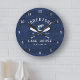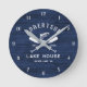 Añada un toque personalizado a la casa familiar del lago o a la casa de campo junto al lago de montaña con este reloj rústico, con sus remos cruzados y un pez puente sobre un fondo rústico de madera azul marino, con nombre familiar, ubicación en la casa del lago y fecha establecida en plantillas de texto fáciles de usar.