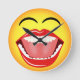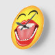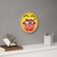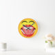 Cara sonriente © Sunny Mars Designs. Este fresco, humorístico, divertido, novedad de tamaño medio reloj de pared redonda cuenta con un gracioso ilustracion de un emoticono facial amarillo riéndose con una boca abierta, dientes brillantes de perlas blancas, lengua y ojos cerrados. Concepto de humor.