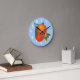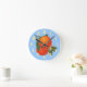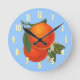 Reloj de pared de cocina retro con números blancos y amarillos y arte vintage de dos naranjas maduros en una rama con flores blancas pequeñas que florecen contra hojas verdes en un fondo azul. Haga clic en Personalizar para cambiar los colores de fondo, dimensionar, agregar su nombre o mensaje y más.