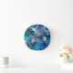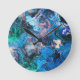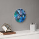 Este colorido reloj de pared muestra la obra de arte original "Swirling waves", una pieza de pintura en la que los colores se mueven y se mezclan como el agua que gira.