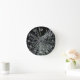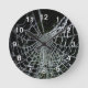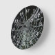 Reloj con foto de telaraña cubierta de escarcha/hielo, con follaje verde en segundo plano